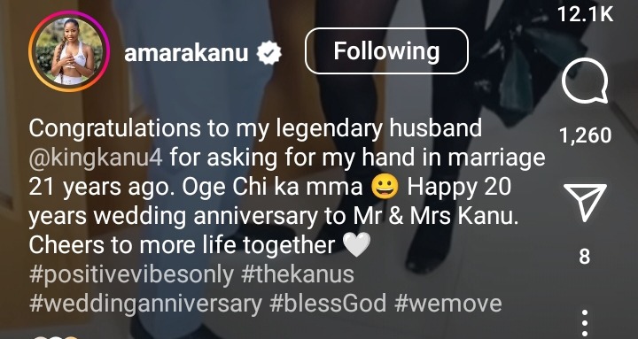 Congratulations to my husband Kanu for asking my hand in marriage 21 years ago' - Amara Kanu