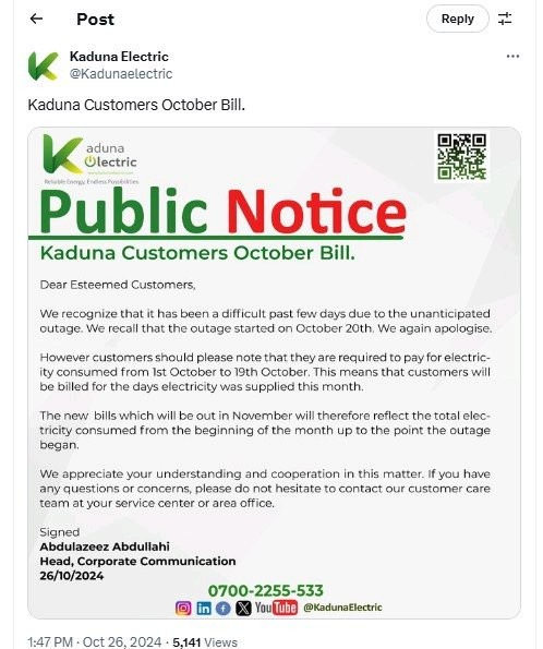 However, as a result of the power outage in Kaduna and its environs, the electricity Distribution Company announced on Saturday that residents will only pay for power consumed from October 1 to October 19.