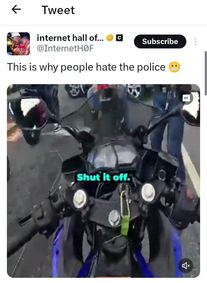 Sharing video of the foreign police officers asking some bike riders to sit on the floor after stopping them in traffic, a Twitter user wrote: "This is why people hate the police"