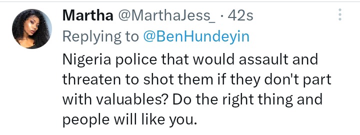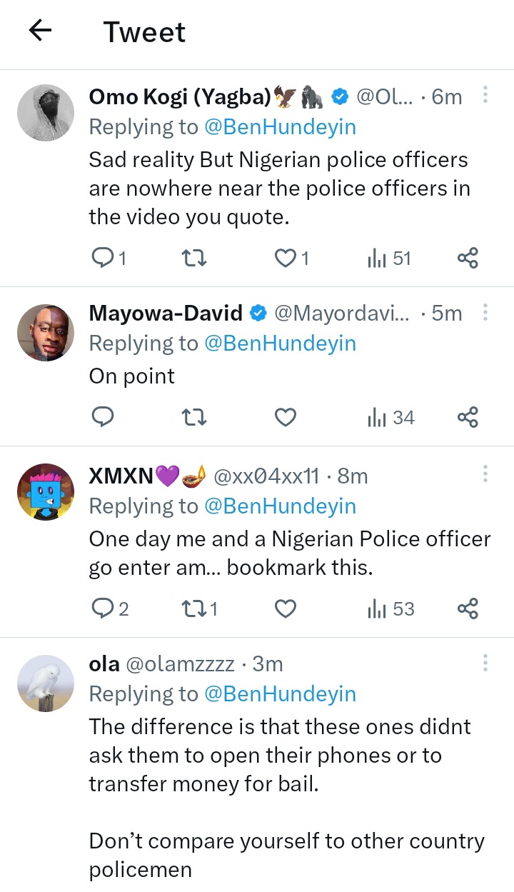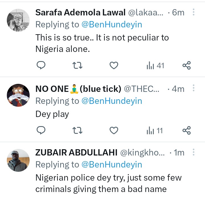 This reaction from Benjamin Hundeyin has attracted reactions from Nigerians and social media users, as some have said the Police in the video didn't ask for the bike riders phones, while some have said it is no peculiar to Nigeria alone.