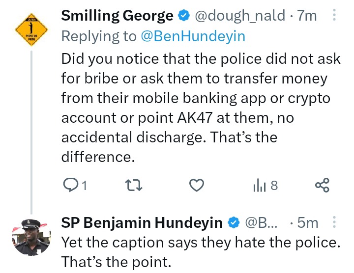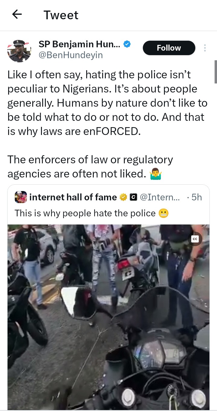 This video from the man has attracted reactions from Nigerians, one of which was from the Lagos State Police Command Public Relations Officer PRO, Benjamin Hundeyin, who tweeted: "Like I often say, hating the police isn't peculiar to Nigerians. It's about people generally..."