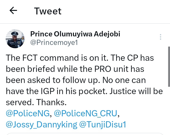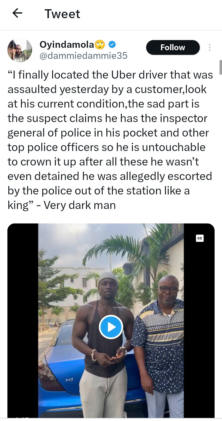 This video of Very Dark Man with the assaulted Uber driver in Abuja, has attracted reactions from Nigerians, one of which was from the Nigerian Police Force Public Relations Officer FPRO, Prince Olumuyiwa Adejobi, who tweeted: "The FCT command is on it..."