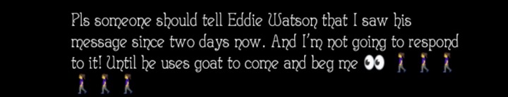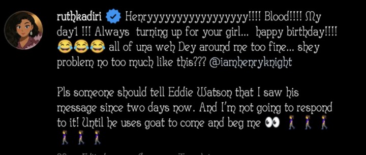 In her post, Ruth revealed that she saw Eddie’s message two days earlier but deliberately chose not to respond. She firmly stated that until he brings a goat as part of his apology, she has nothing more to say.