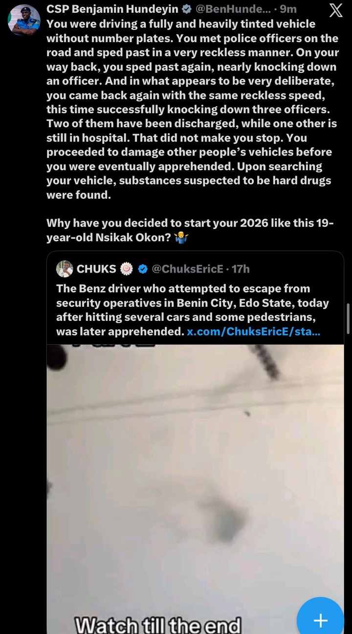 In a statement posted on X on Friday, January 16, 2026, the Force Public Relations Officer, CSP Benjamin Hundeyin, provided details of the incident, which occurred the previous day during a routine patrol. According to the police, the suspect, identified as Nsikak Okon, was driving a Mercedes-Benz GLK with darkly tinted windows and no visible number plates when officers first spotted the vehicle.